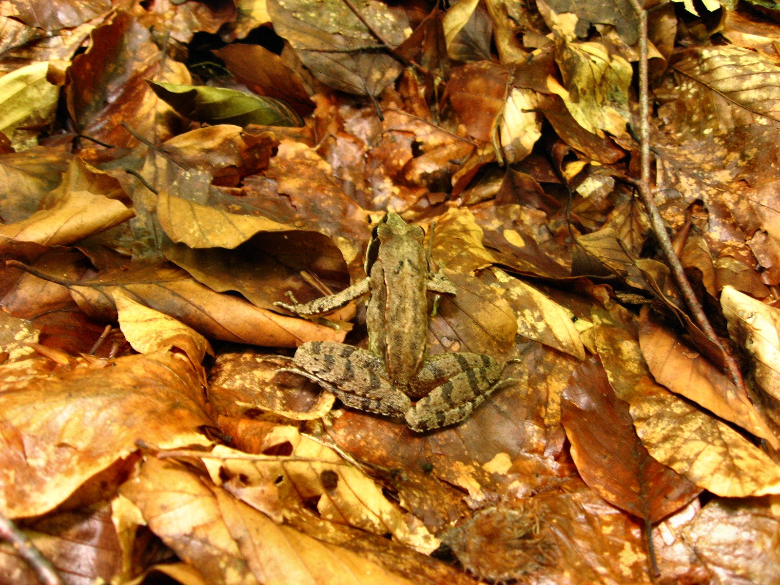 | Mesteri rejtőszínezetük ellenére a fürkésző szemek észrevehetik az avarban lapuló erdei békákat (Rana dalmatina) |